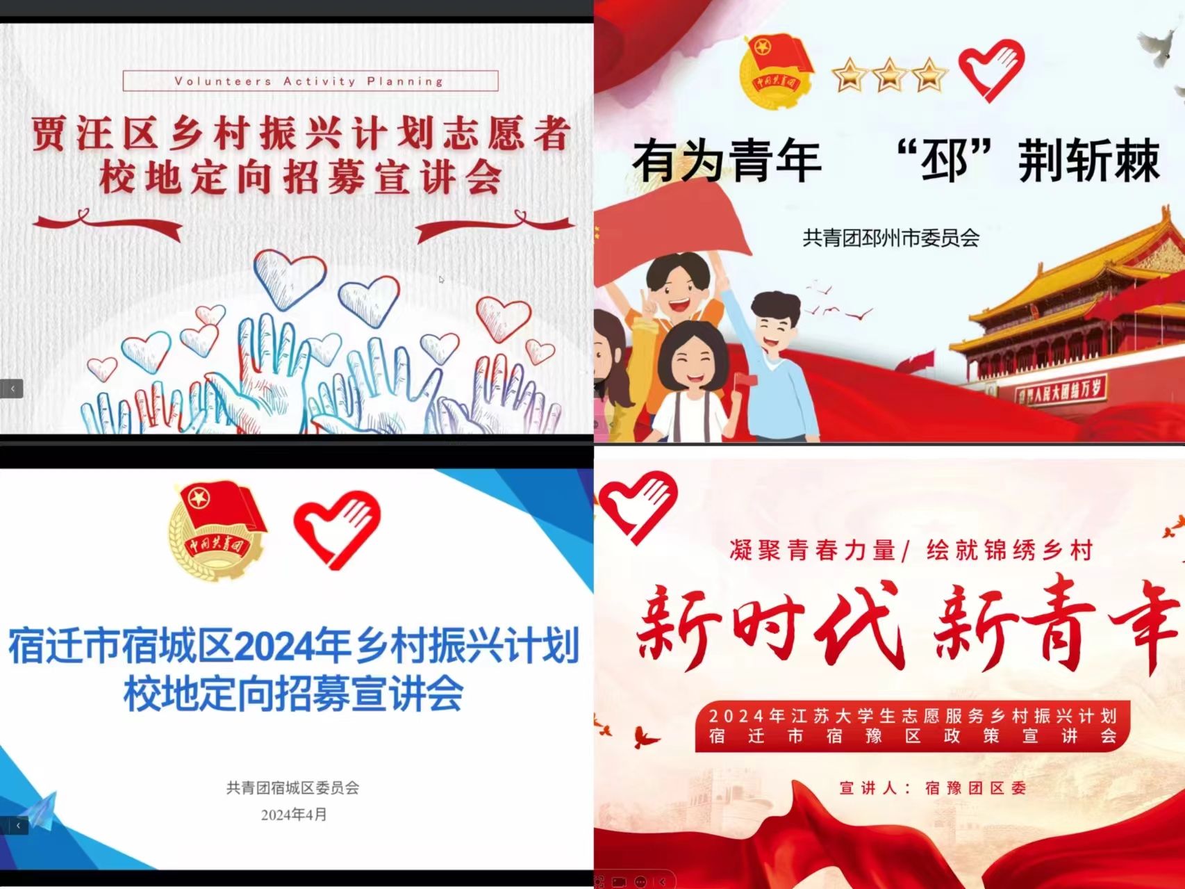 4.18日下午,校团委举行了2024年江苏省大学生志愿服务乡村振兴计划校地定向专项的线上宣讲会,旨在动员和号召广大青年学子积极投身乡村振兴的伟大事业。宣讲会由校团委徐锐老师主持,五个校地定向对接的团区委负责人依次共享屏幕,从地区情况、政策支持、招募流程、工作内容及活动展示等方面进行了详细介绍。
