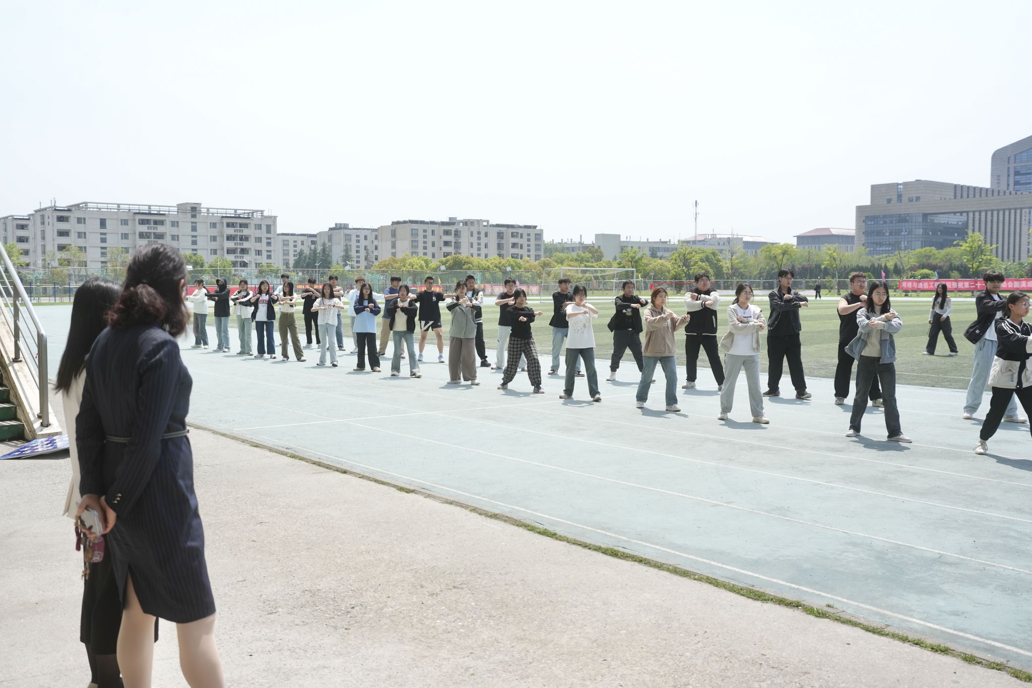 春风和煦,一年一度的校园春季运动会即将到来。为了提升参赛同学的备赛积极性,4月22日中午,网络与通信工程学院在北区操场开展了赛前动员并进行了慰问活动,院党委书记沐阳、辅导员袁彩霞及广播操、啦啦操参赛同学参加了活动。