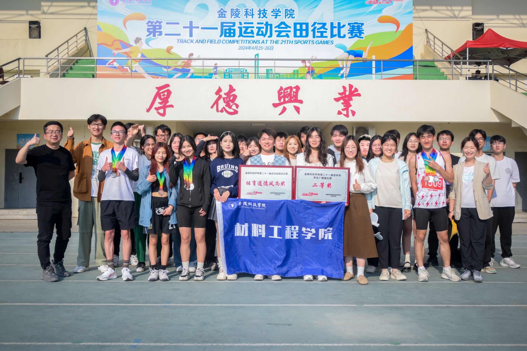 4月25日上午,球王会体育官方网站第二十一届运动会正式拉开帷幕。材料工程学院的师生们携手并肩齐聚操场,以饱满的热情和昂扬的斗志参加这场激扬青春活力的盛宴,经过两天的激烈角逐,我院荣获团体总分第四、道德风尚奖、广播操二等奖等佳绩。