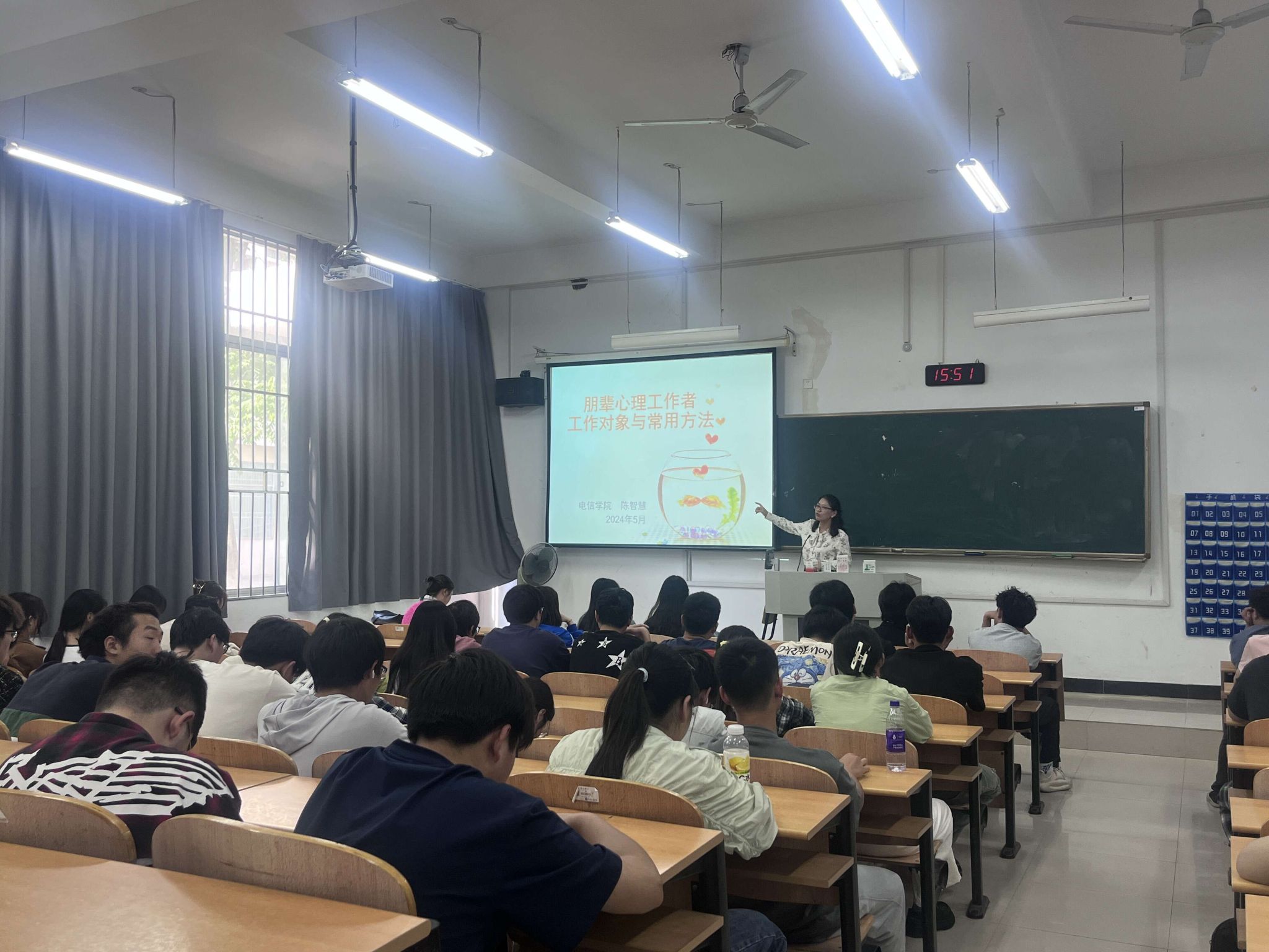 为了提升大学生的心理健康水平,宣传朋辈心理工作者的工作职责,有效预警大学生心理危机,促进大学生身心健康的全面发展,电信学院于2024年5月8日下午3点40分在4102教室成功举办了题为“朋辈心理工作者的工作对象与常用方法”的心理培训会。本次培训由电信学院党委副书记陈智慧担任讲解嘉宾,近100名心理委员和心理联络员报名参加。