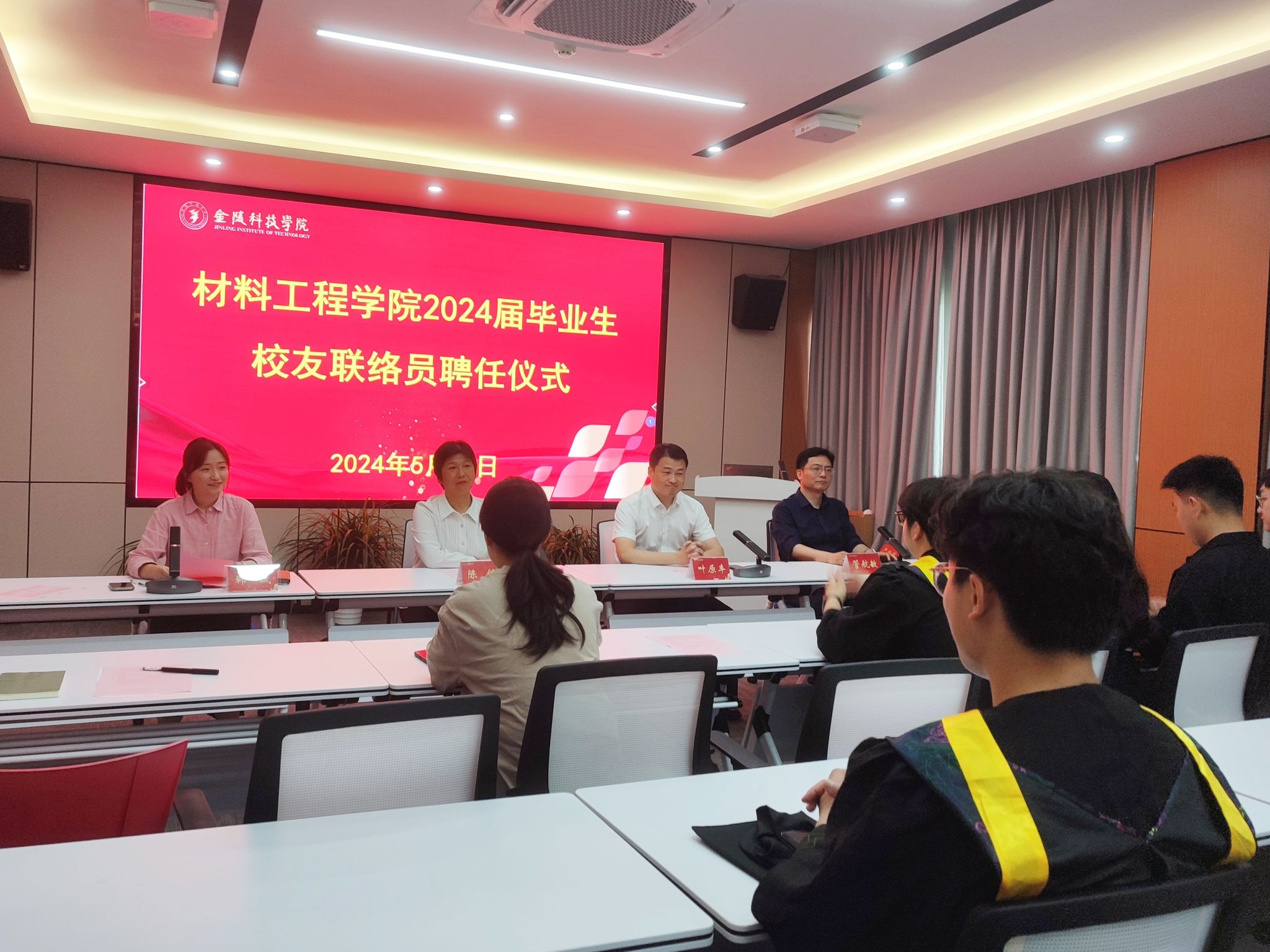 为了弘扬校友情谊,促进校友与学院之间的联络交流与合作,材料工程学院于5月21日上午,在知行楼A506隆重举行了“2024届毕业生校友联络员聘任仪式”,院党委书记陈健、院长叶原丰、党委副书记韩铖,副院长管航敏、毕业班辅导员许倩颖、邵云龙以及学院校友联络员华岚芳参会,共有三十位优秀毕业生受聘参加会议。