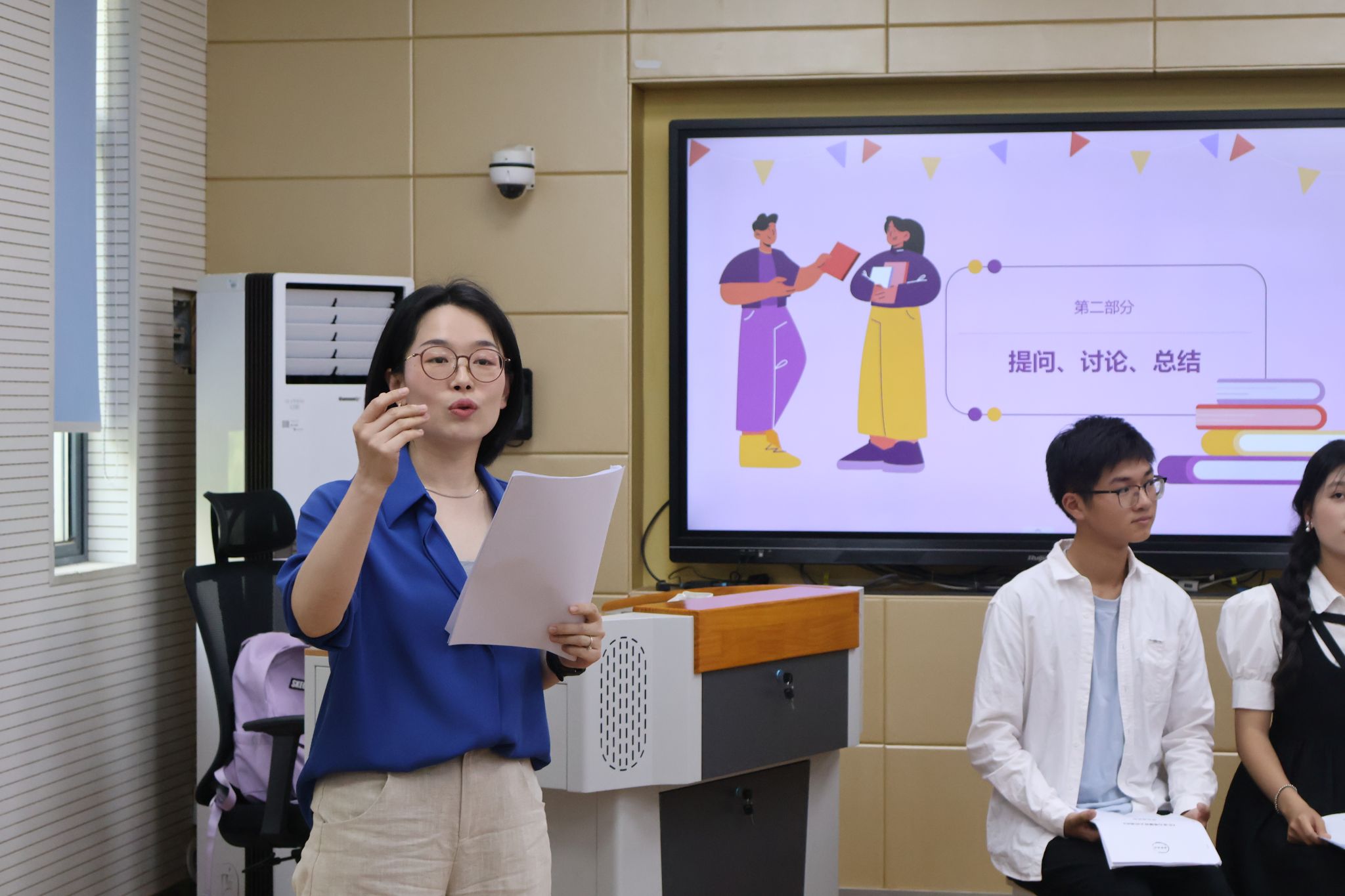 演出结束后,活动进入角色小结环节。演员们逐一就所饰演的角色进行自我评价,深刻剖析角色的内心世界与情感变化,赢得了观众的一致好评。此外,本次剧本的主编22行政管理(2)班方宇虹也分享了她的创作心得与剧本背后的故事,使在场观众对剧本有了更为深入的了解。最后,活动进入讨论与总结阶段。老师们与观众们围绕剧本展开了热烈的讨论,提出了宝贵的修改完善剧本的建议。靖老师针对宿舍剧情设置提出了针对性的修改意见,汪新老师则结合学生工作的学生心理,就剧本创作与表演希望进一步深入和探讨。王业薪学长也结合过去参演话剧的经验,从剧本主题入手,希望突出“矛盾点”强调“沟通的重要性”。主创团队与演员们表示虚心接受各位老师的意见,继续努力提升剧本质量与演技水平。