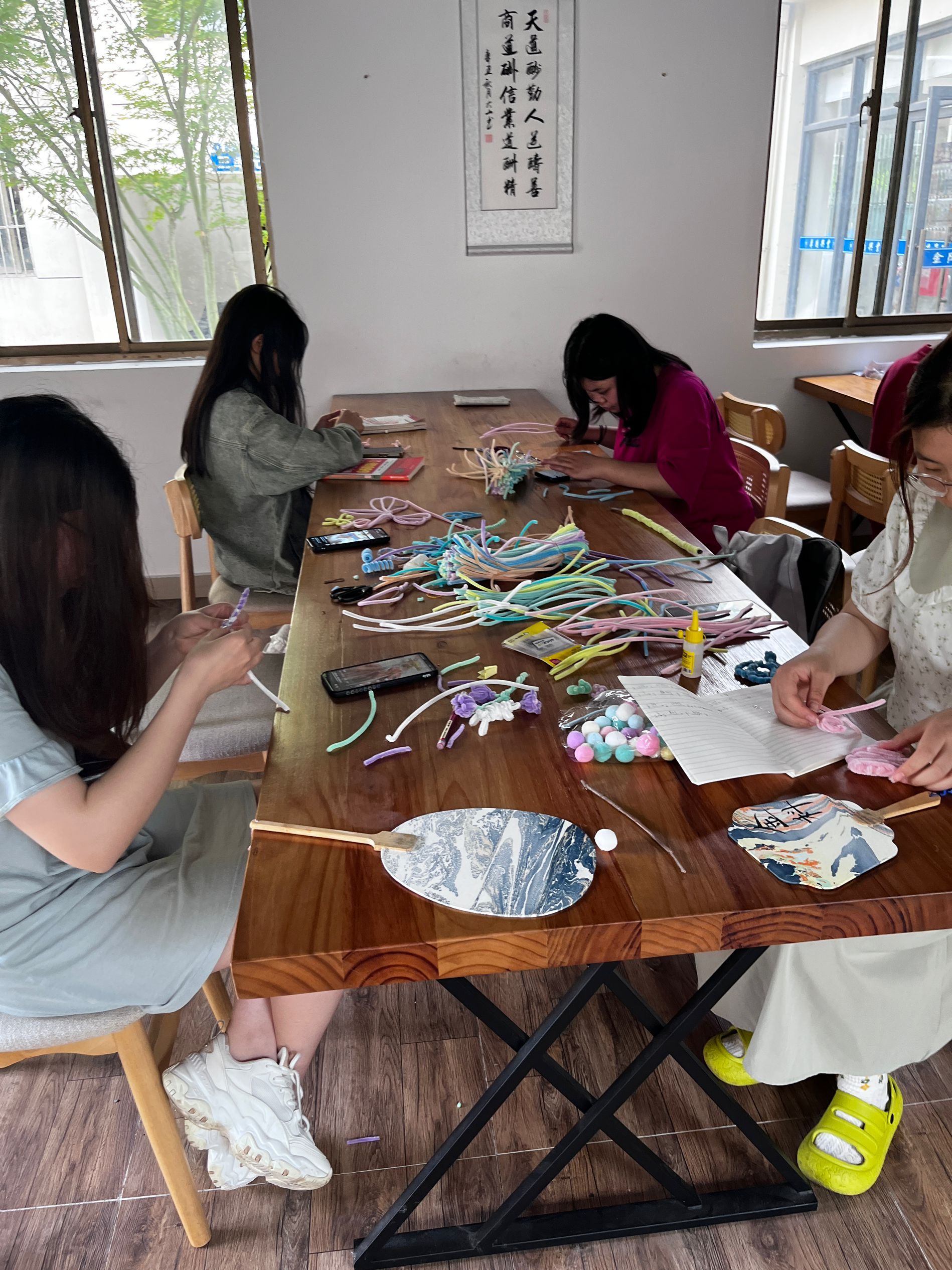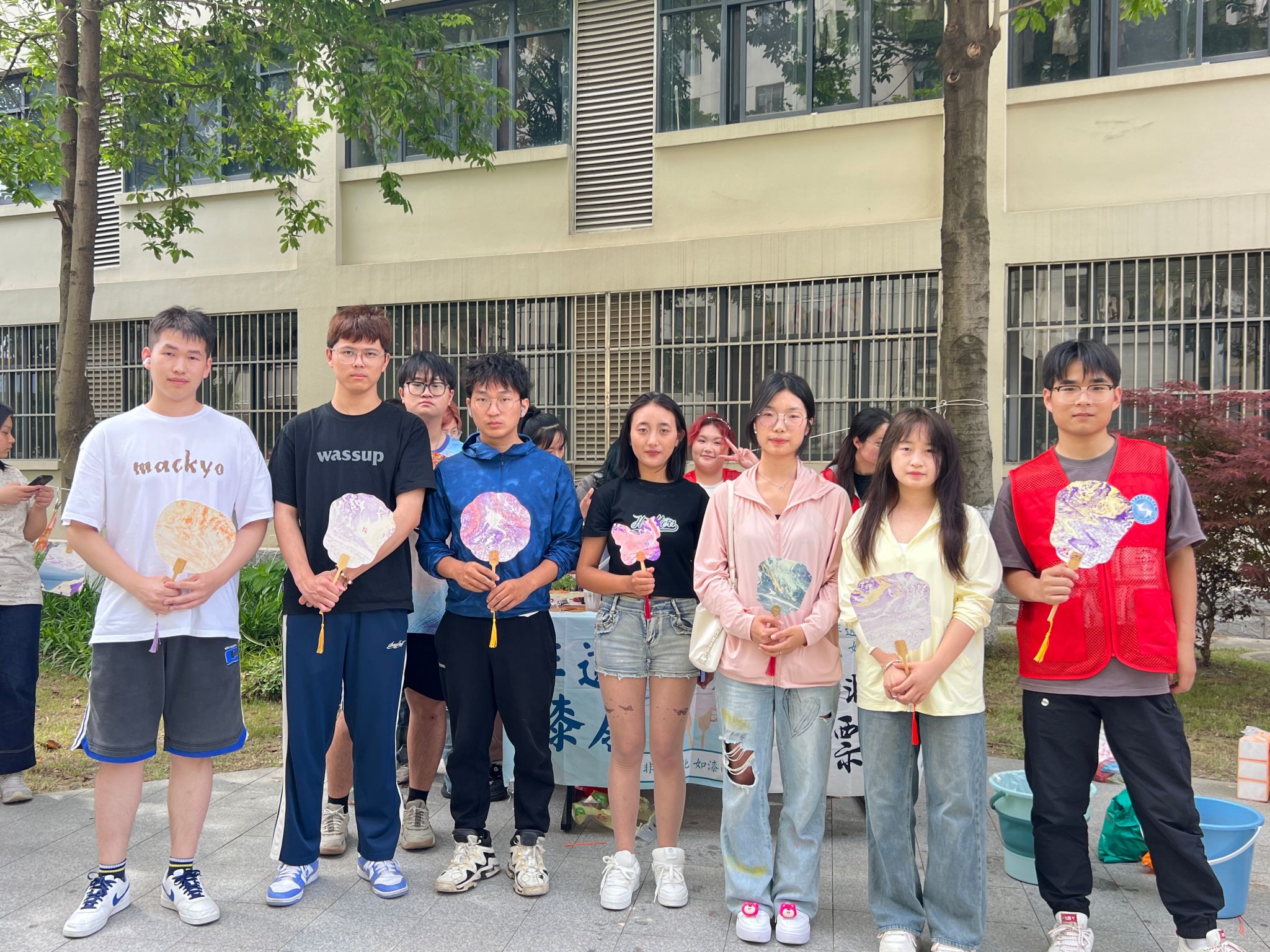 此次活动共吸引全校70余名学生参加,活动分为室外漆扇,室内绒花两部分,整个活动过程的选材配色都由同学自由创作,让大家从“心”动手,从“新”创造。漆扇制作现场色彩缤纷,活泼热情的“满山日色”,典雅秀丽的“直上青云”,磅礴恢弘的“青云志”......滴墨、入水、题字,精彩扇面纷纷,阳光下金漆闪闪,昭显金科学子蓬勃青春。室内的绒花制作,同学们尝试创新,由小变大,将一根根扭扭棒变成姿态各异的花朵,更有花环蝴蝶等造型作品,一室静谧,让将去的春色停留手心。