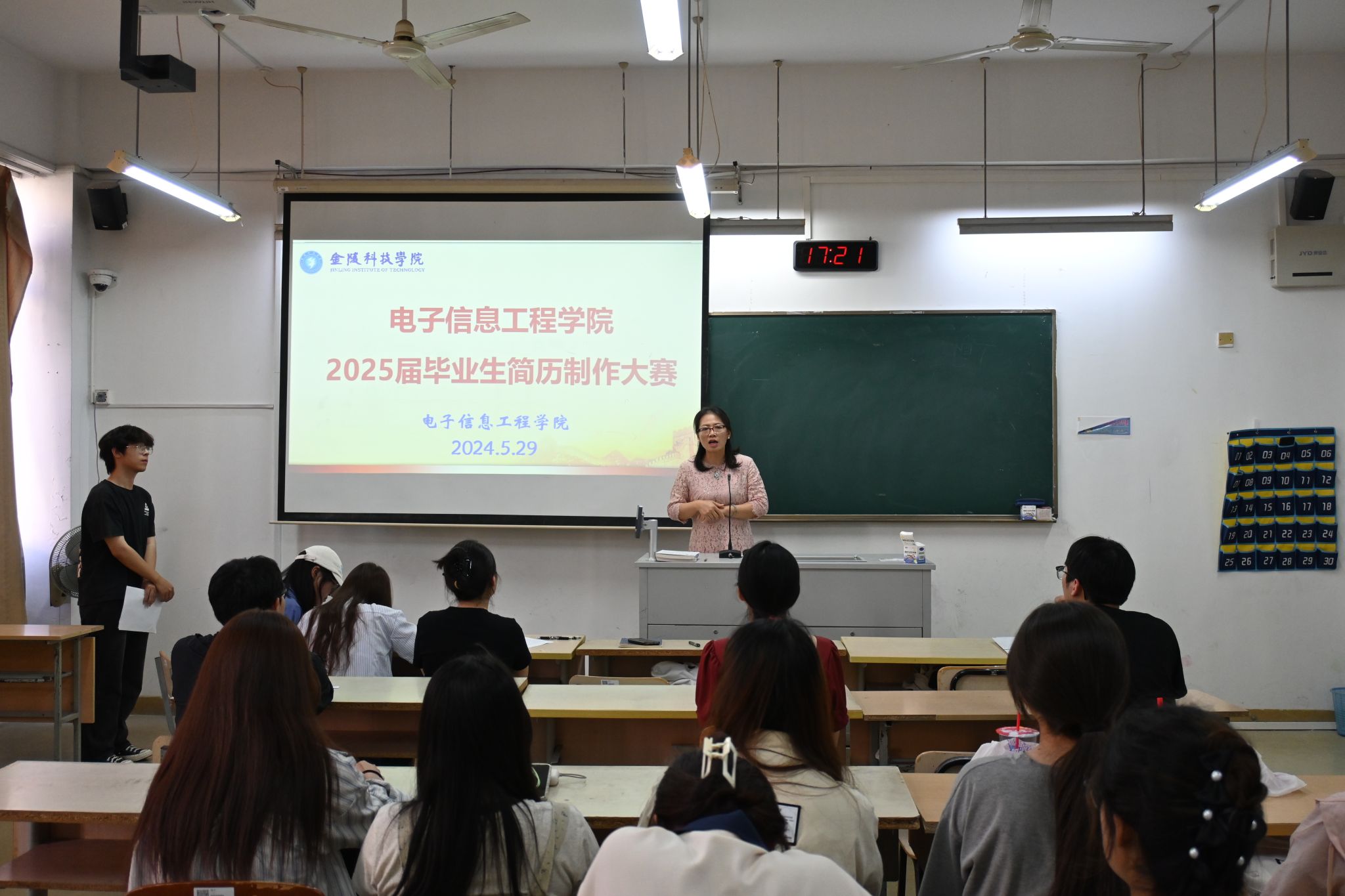 为提高2025届毕业生职场求职竞争力和就业行动力,促进高质量就业,督促学生在下半年秋招前做好求职准备,电子信息工程学院于2024年5月29日下午举办了2025届毕业生简历制作大赛决赛。决赛现场由学院党委副书记陈智慧、辅导员征文维和部分学生代表担任评委,大批在校生学生代表观赛。