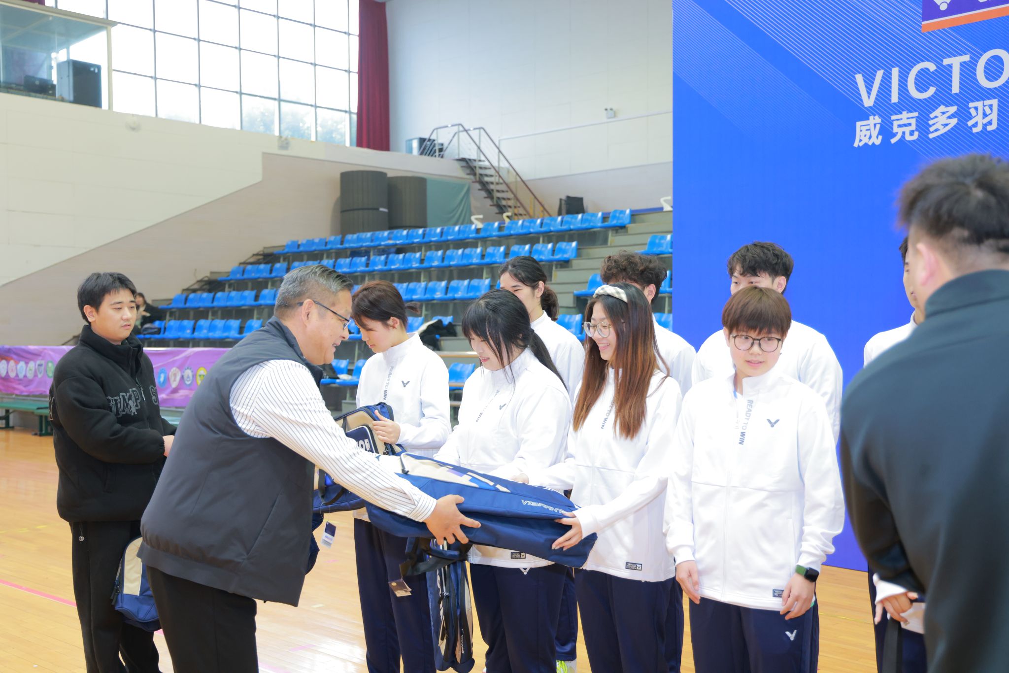 在双方代表的见证下,沈辉与赵洪亮郑重签署了合作协议,标志着球王会羽毛球队与威克多的合作正式拉开序幕。双方将在资源共享、优势互补的基础上,共同推动羽毛球运动的普及与提高,为培养更多优秀的羽毛球人才贡献力量。仪式结束后,沈辉与赵洪亮为校羽毛球队队员分发了崭新的羽毛球装备。