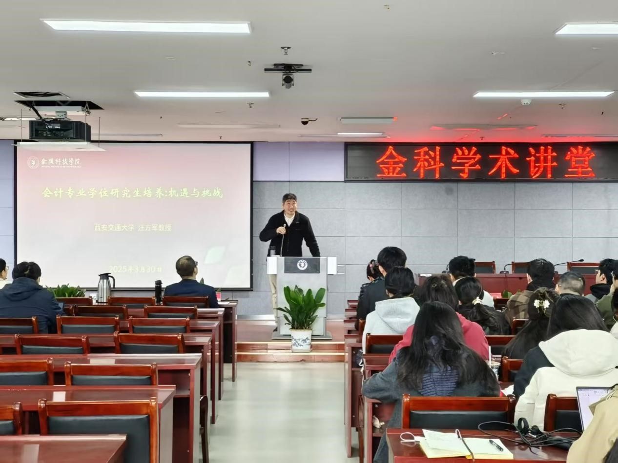3月30日,2025年第9期金科学术讲堂暨商学院2025年第1期“望心湖研究生名家讲坛”在江宁校区科技楼3号楼313会议室顺利举行。本期讲堂特别邀请到西安交通大学汪方军教授,为球王会师生带来题为《会计专业学位研究生培养:机遇与挑战》的专题讲座。商学院院长刘磊、部分科研骨干教师以及全体专硕研究生共50余人参加了此次讲座,讲座由商学院副院长黄阳主持。