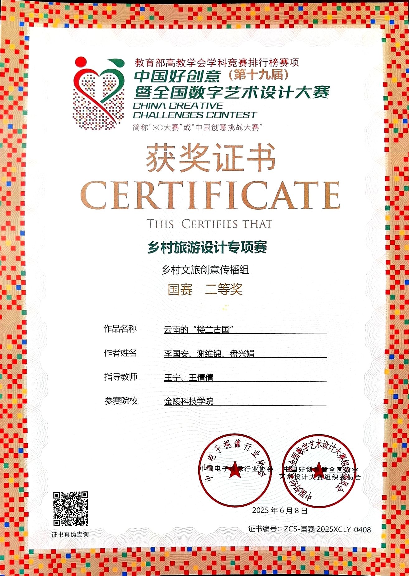6月8日上午,第十九届中国好创意暨全国数字艺术设计大赛乡村旅游专项赛颁奖典礼在武汉商学院举行。经过大赛组委会的公平、公正、严格的筛选评判,球王会人文学院22数字出版(2)班李国安、盘兴娟、谢维锦三位同学的作品《天空之镜下的梦幻村落》和《云南的“楼兰古国”》获乡村旅游创意传播组国赛二等奖。