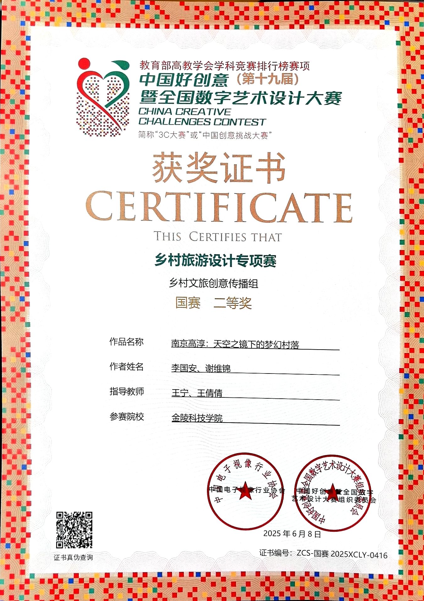 该项赛事全国2000多所高校参加,参赛作品共收到12000多件,其中420个优秀作品进入终评答辩环节,75件作品荣获一等奖,125件作品荣获二等奖,220件作品荣获三等奖,获奖率为3.5%,含金量较高。作品《天空之镜下的梦幻村落》里,跟随创作者的镜头,我们感受到了南京高淳石臼湖一望无际,碧波荡漾,浪漫清新的镜面效果。作品《云南的“楼兰古国”》则带领我们走进了云南建水团山村原生态的建筑风貌群。三位学子通过创意、创新、创造的多元展现形式,为推动优秀乡村文旅设计成果转化落地贡献了青春力量。