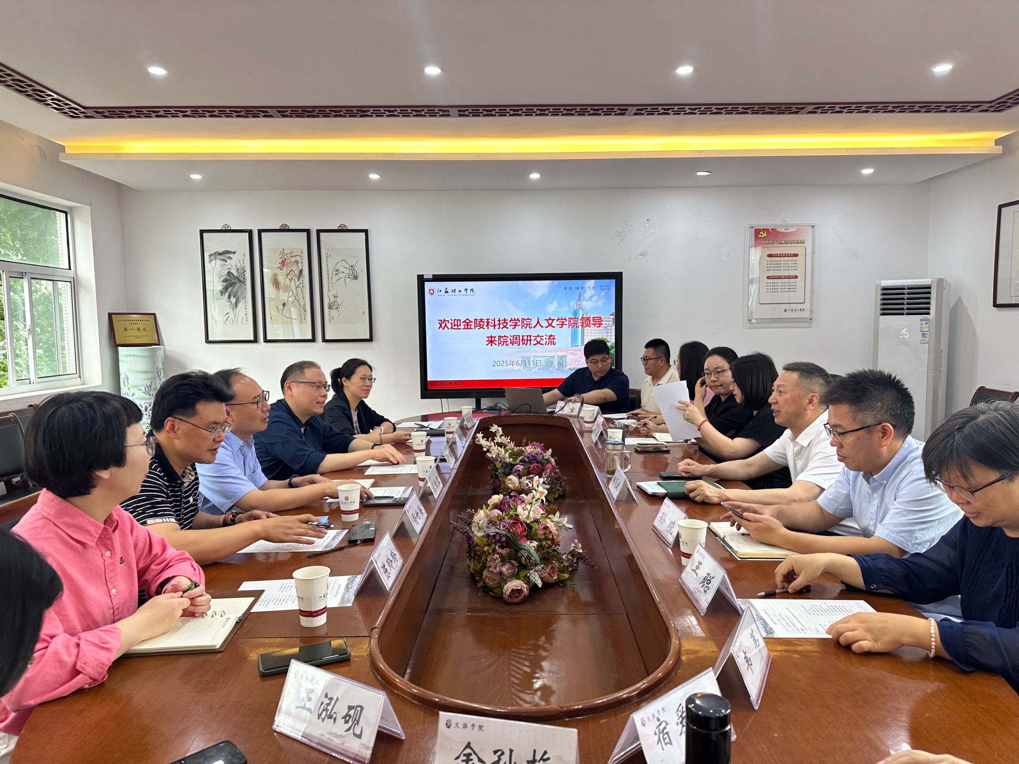 6月11日下午,人文学院院长张维亚,综合办公室主任俞世海,旅游管理系教师汤澍、陈玲玲、徐子琳和张迎莹等前往江苏理工学院文化与旅游学院进行调研交流。江苏理工学院文化与旅游学院院长演克武、院长助理陈晓艳、旅游管理系主任叶帅、酒店管理系主任干霖、旅游管理与服务教育系主任王娟及相关专业教师和学工团队参加了本次活动。