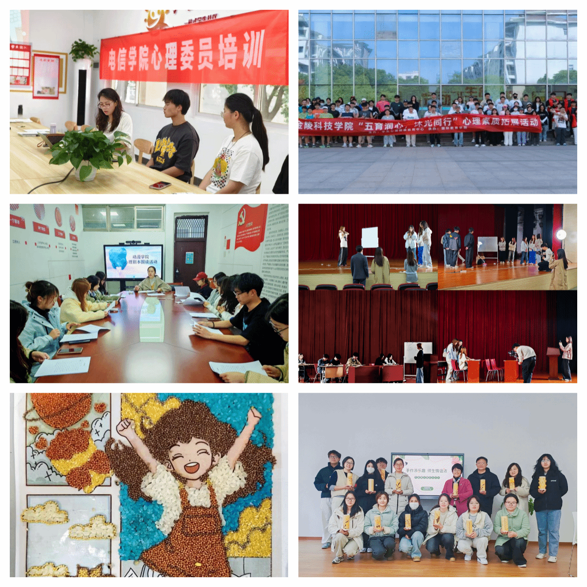 电信学院的“心理委员队伍建设”专题培训,聚焦理论知识与实践技能提升,以德育心,引导心理委员理解助人工作背后的责任担当与人文关怀;动漫学院的“心理剧剧本围读”活动,巧妙融合沉浸式剧本围读与深度心理探讨,以智慧心,培养学生运用理性思考、共情理解和多元视角来应对心理挑战的内在智慧,让心灵在体验与反思中获得真正的滋养和成长;国教院的心理素质拓展之“校园定向越野”活动,将知识性与运动性深度融合,以体强心,强健学生体魄,有效发挥体育调节情绪、纾解压力的功能,助力塑造学生健康心理与坚韧品格;园艺学院的“种韵澄怀,笔耕心田”主题种子画活动,引导学生以植物种子为媒、艺术创作为桥,以美润心,锻炼学生的耐心、专注力与审美创造力,以自然之美滋养心灵;外语学院的“牛皮纸小夜灯”手工活动,师生齐聚一堂,通过亲手实践,在创作中释放学业与生活压力,以劳健心,感悟收获源于付出的喜悦,促进学生身心全面发展。各学院全面推行“心理+”五育融合育心模式,精心策划并开展了形式多元、内涵丰富的心理健康教育活动,有效引导学生将心理感悟转化为德育智育体育美育劳动成果,实现心理育人与五育发展的自然融合,有效营造了健康向上、积极阳光的校园文化氛围。