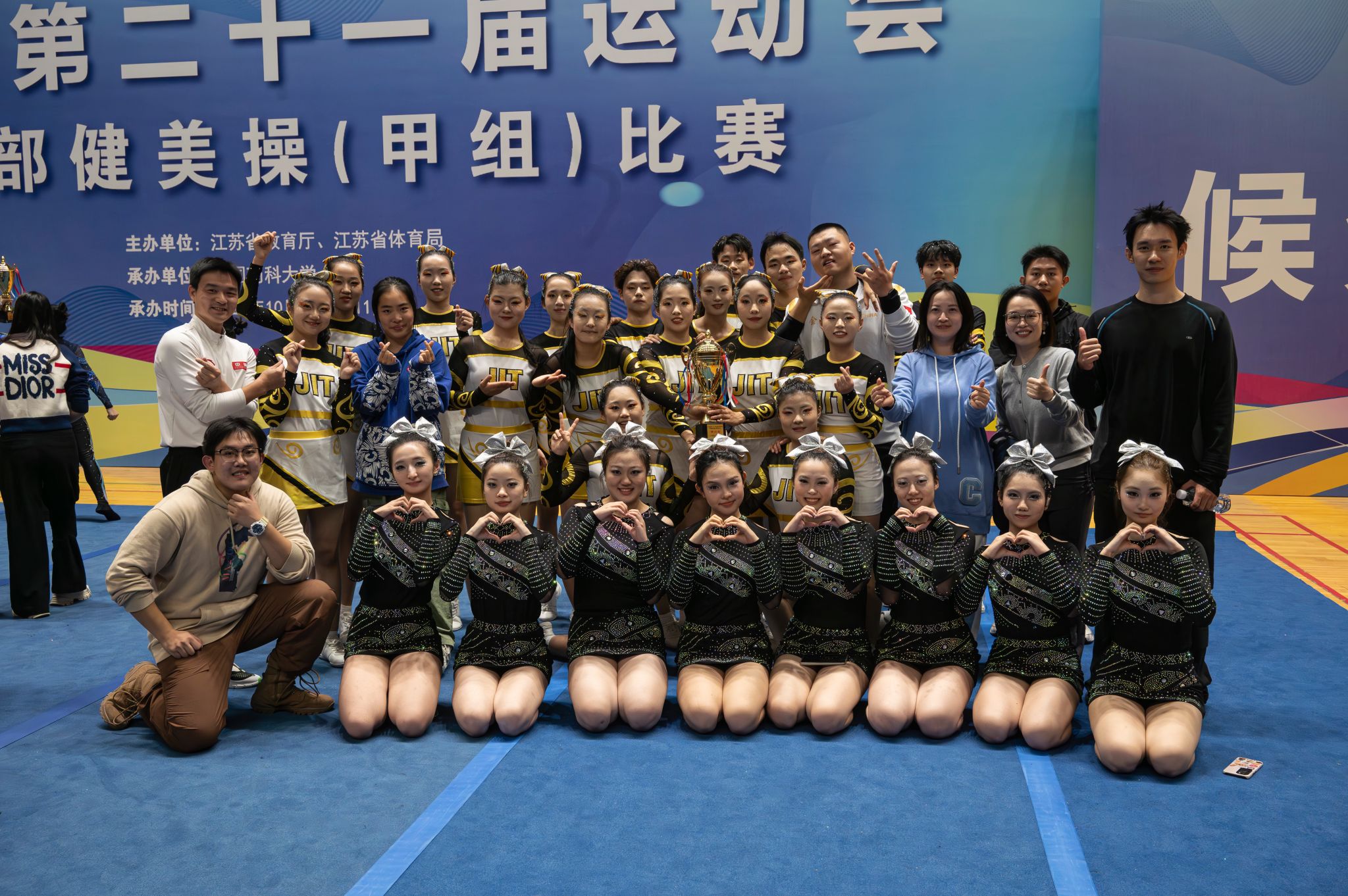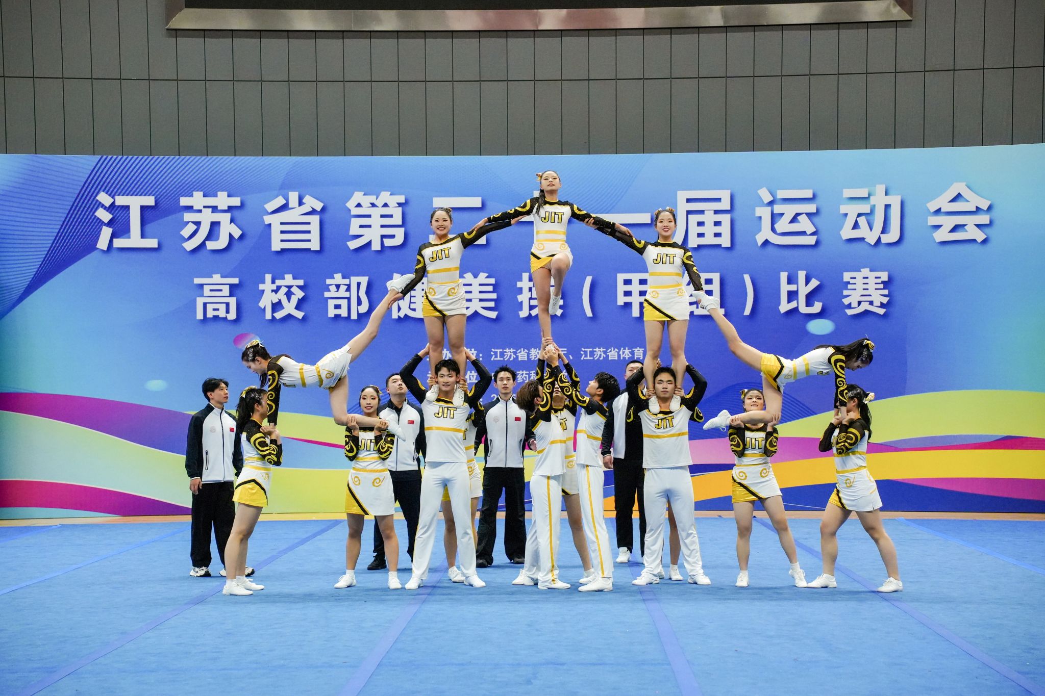 10月30日-11月2日,江苏省第二十一届运动会高校部健美操(甲组)比赛在南京市中国药科大学隆重举行。球王会派出了由商学院、人文学院、网通学院、外院、艺术学院、材料工程学院、国教院、软件学院、智控学院等10个学院共26学生组成的啦啦操队参加了此次比赛,并获得了甲B组花球啦啦操第十二名和技巧啦啦操第三名的好成绩,这也是球王会首次在省运会该项赛事中站上领奖台。