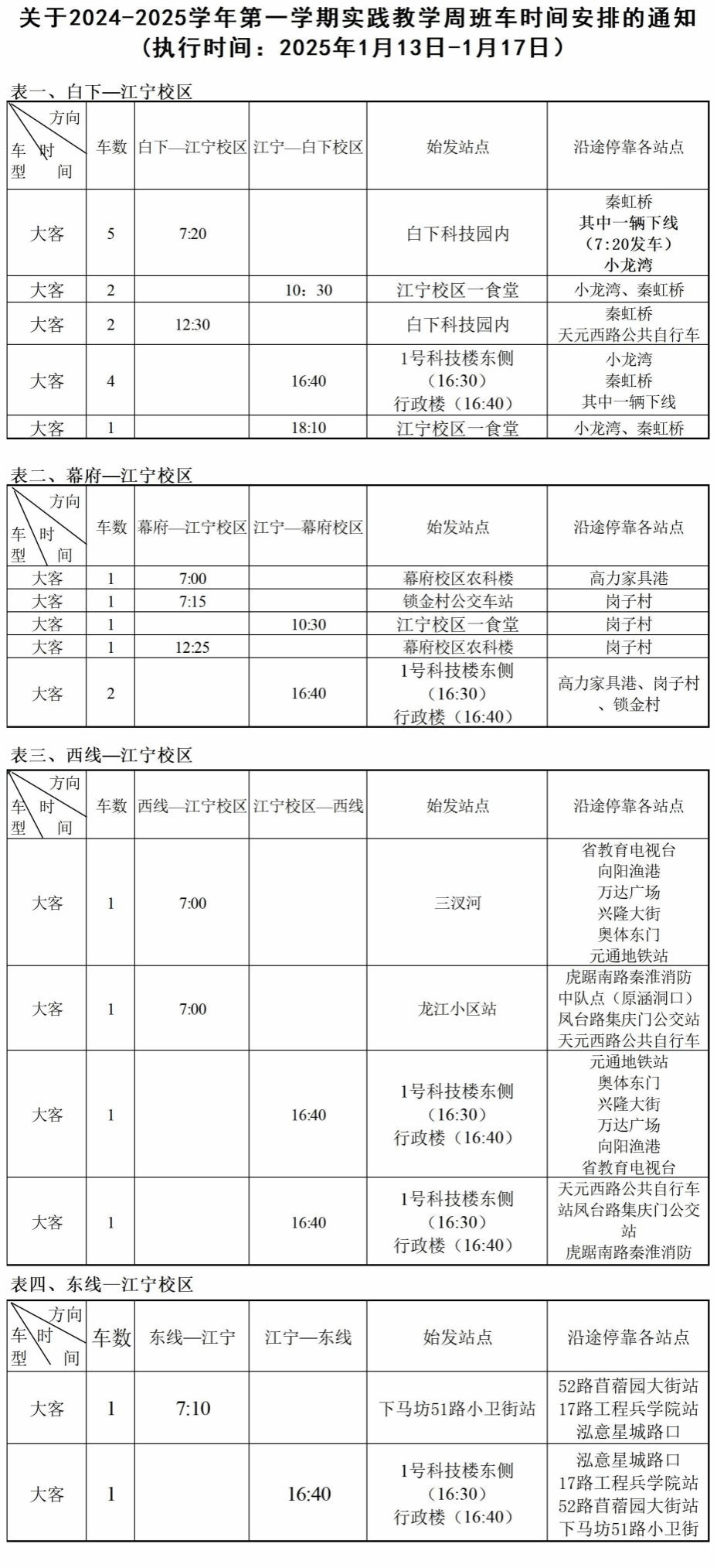 根据学校工作安排,现将第一学期实践教学周班车时间安排(1月13日-1月17日)公布如下: