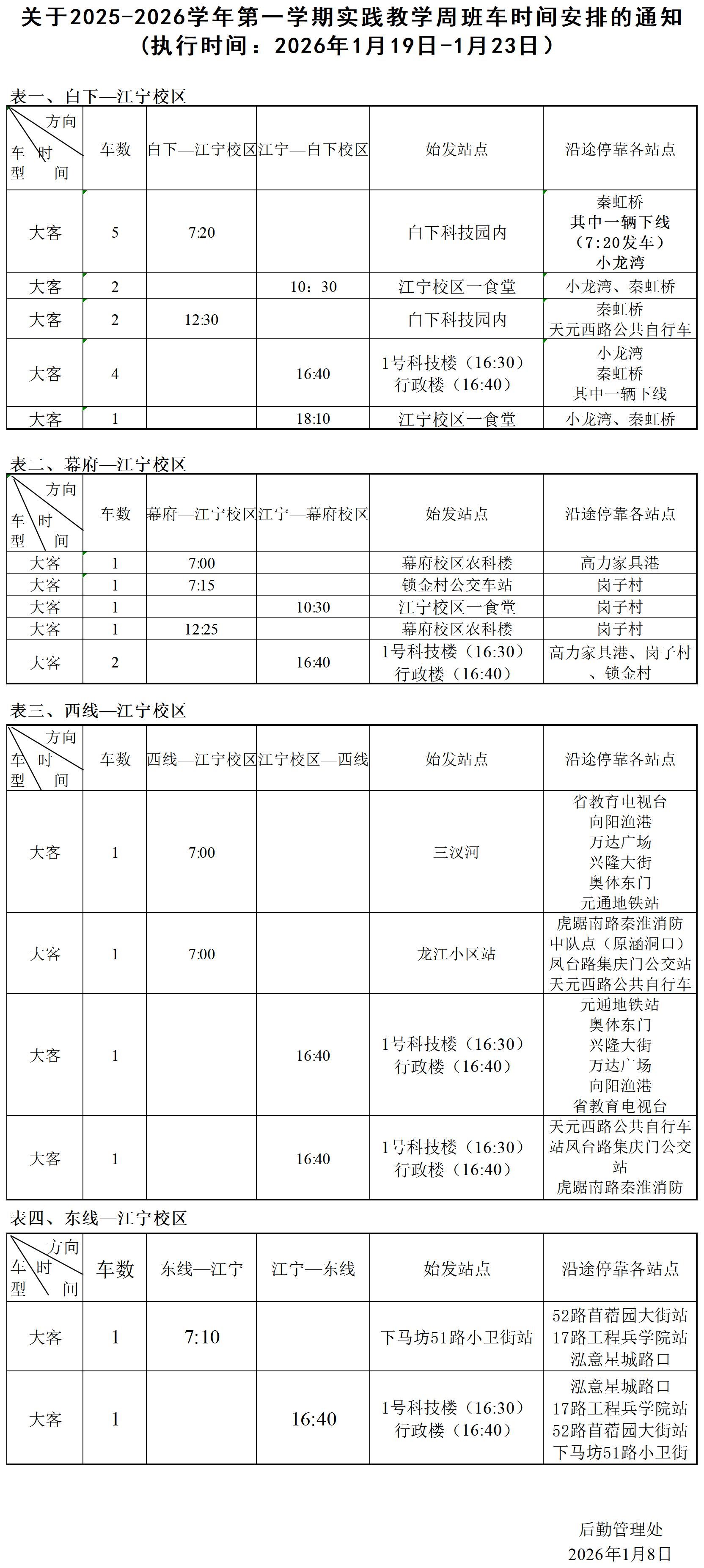 根据学校工作安排,现将2025-2026学年第一学期实践教学周班车时间安排(1月19日-1月23日)公布如下: