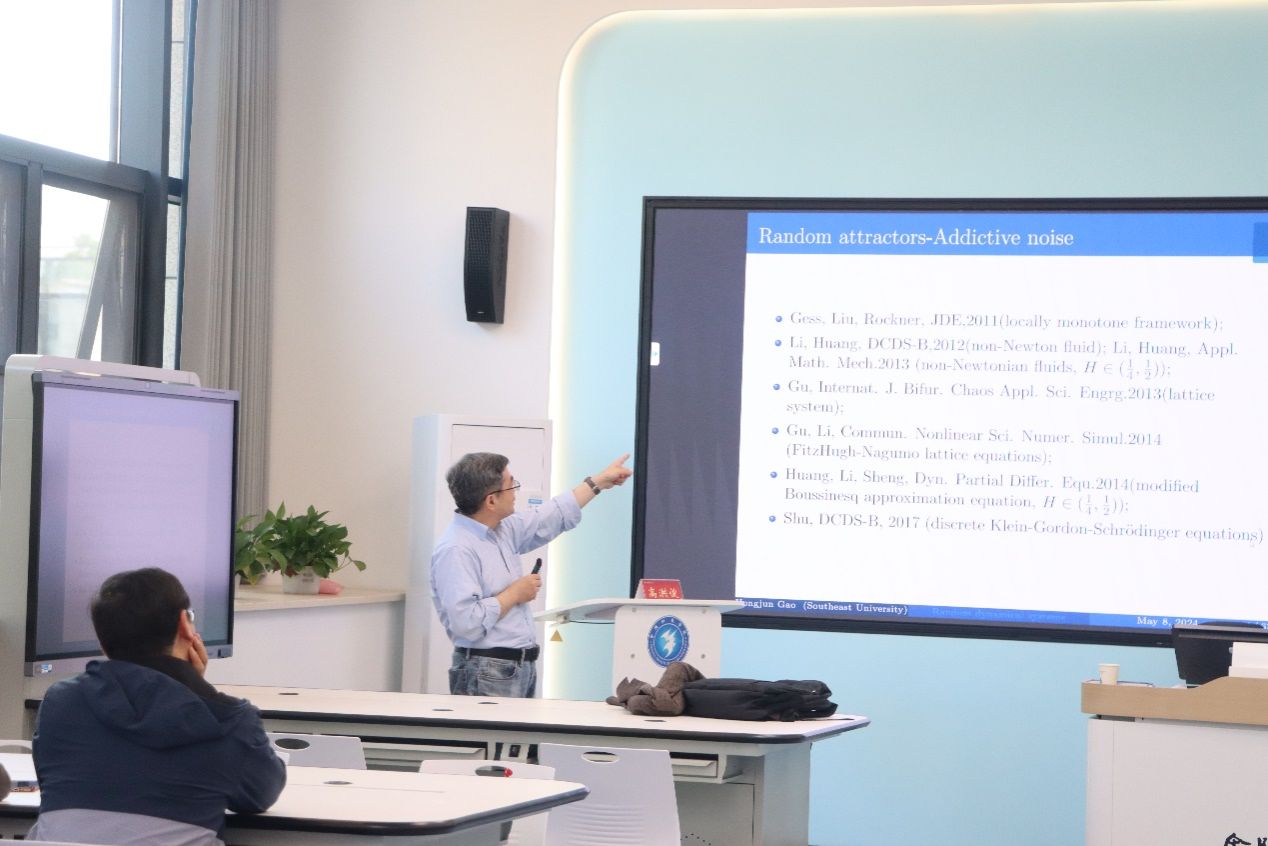 高洪俊教授介绍了粗糙路径的基本概念以及粗糙微分方程动力学的研究进展,给出了最新关于线性乘性噪声驱动的随机微分方程的吸引子的存在性和同步化的结果。其讲解深入浅出,引起了在场师生浓厚的兴趣。针对老师们的提问,高洪俊用直观的语言给予了一一解答。