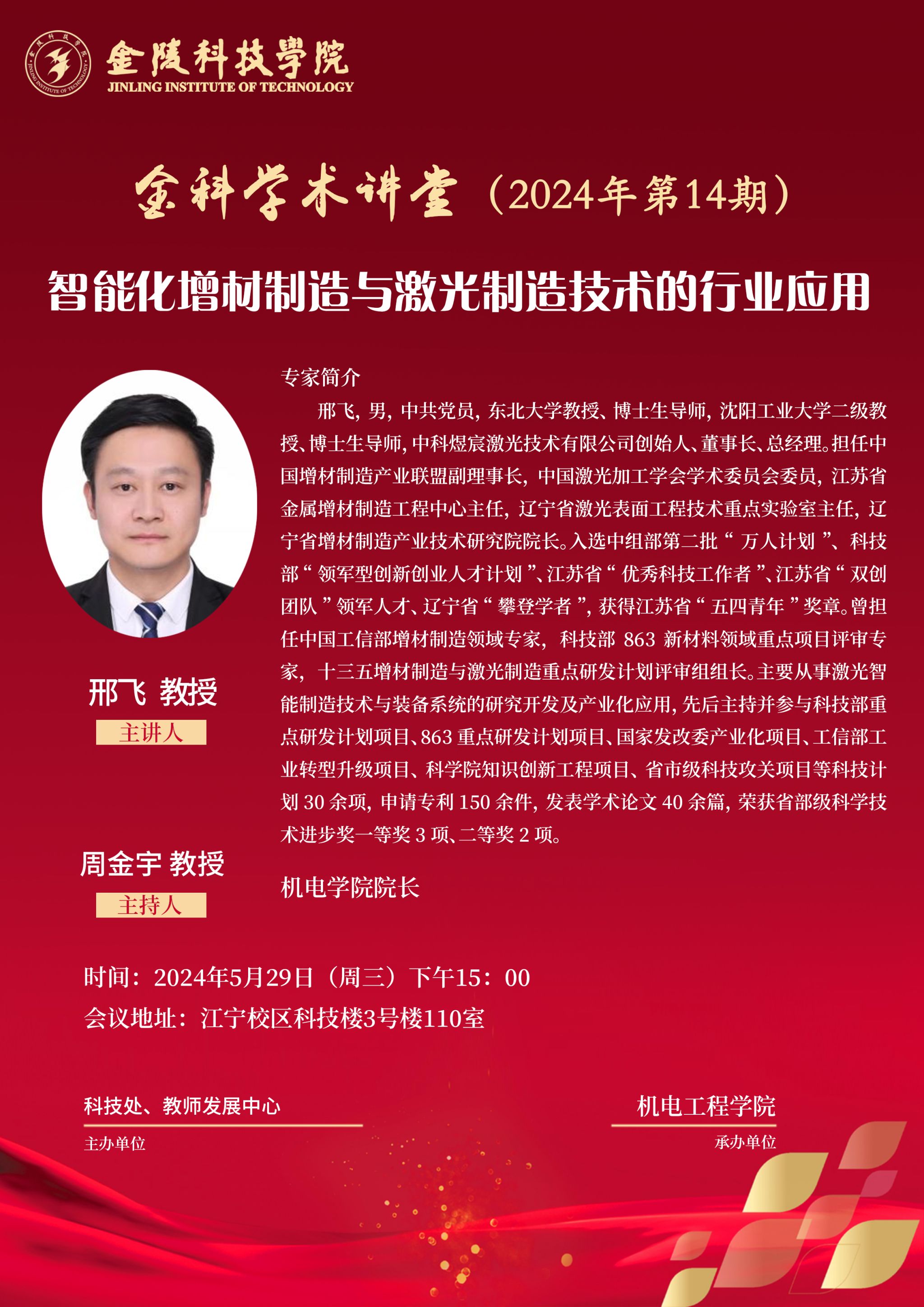 关于举办线下“金科学术讲堂——智能化增材制造与激光制造技术的行业应用”学术报告的通知