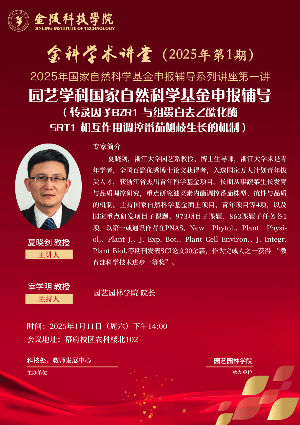关于举办线下“金科学术讲堂——园艺学科国家自然科学基金申报辅导(转录因子BZR1与组蛋白去乙酰化酶SRT1相互作用调控番茄侧枝生长的机制)”学术报告的通知